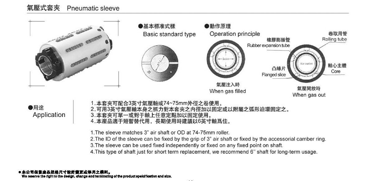气压式套夹是一款非常实用的产品,而且在造价成本等方面,大大节省了客户所要的成本。如果这根气胀轴的长度大于等于一米的时候,客户在选择气胀套方面的成本是比气涨轴更节省成本的,而且在使用的方便方面,气胀套还可以结合气胀轴来使用。